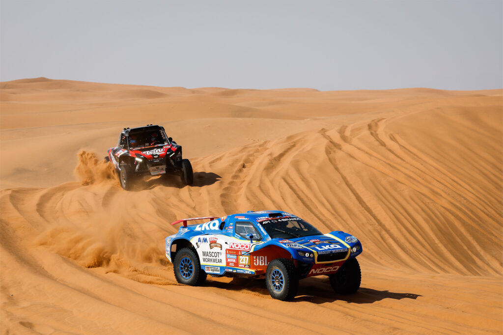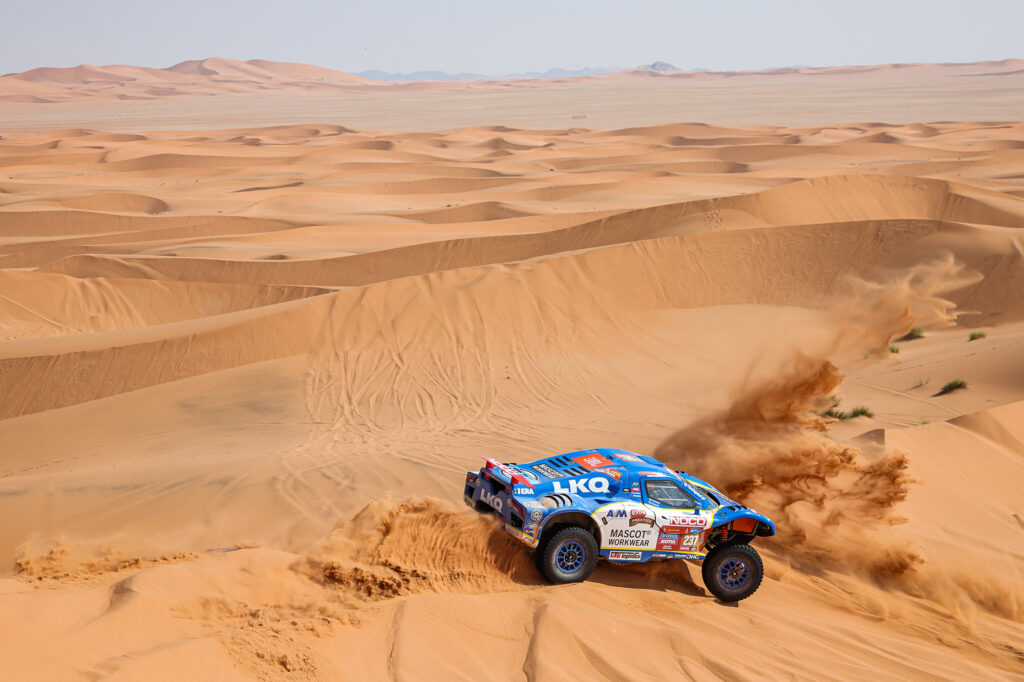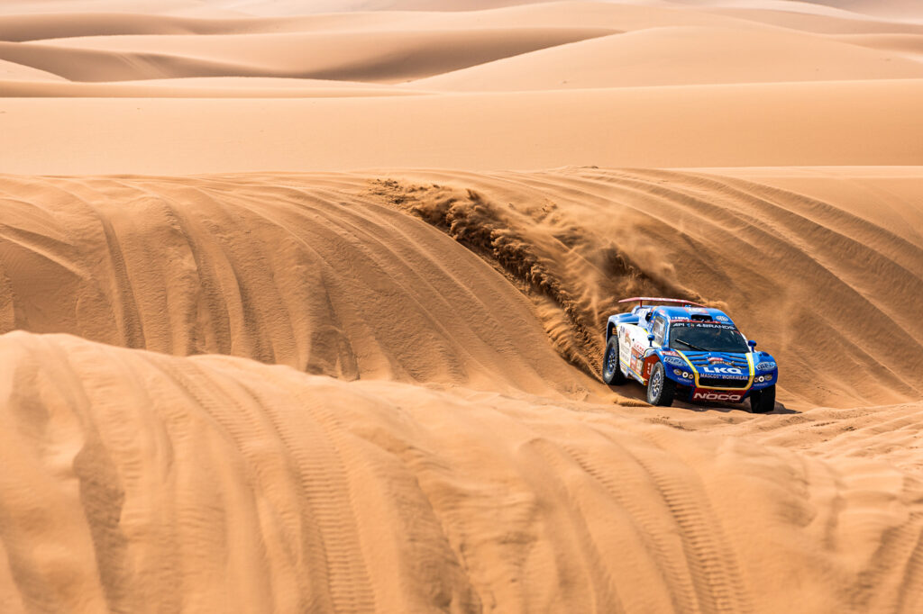 Het was de eerste proef die eigenlijk uit alleen maar zand bestond. “Het was een hele mooie proef,” vertelt Tim. “Lekker in de duinen en verder alleen maar zand. Er zaten wel wat gemene afstappen tussen, een paar keer een klap op gemaakt. Maar de auto voelt goed, dus dat is geen probleem. We kregen onderweg wel nog een alarm, dus die moeten we checken in het bivak. Op naar de volgende.”