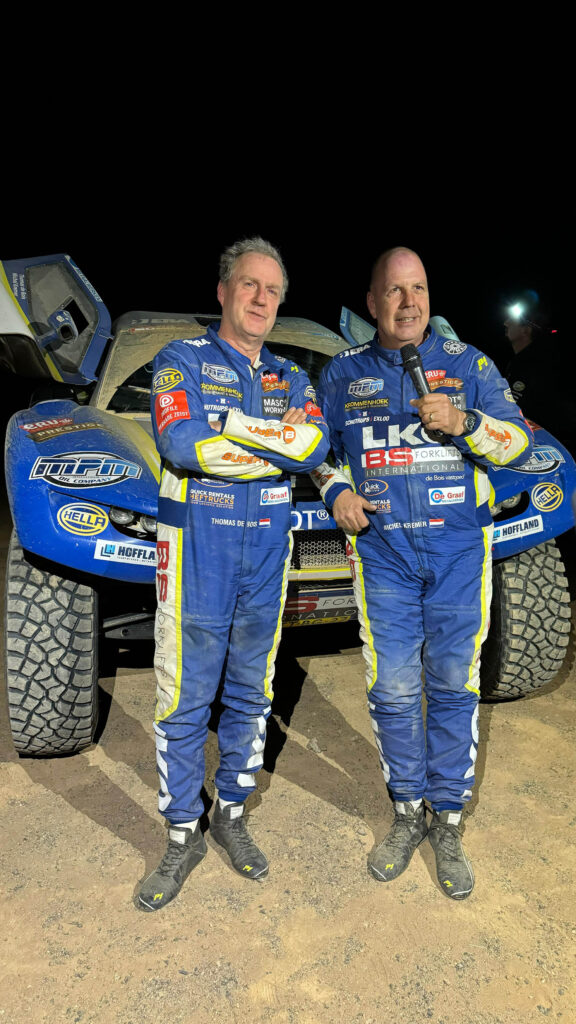 A little after 9:30PM, Michel Kremer and Thomas de Bois drove across the finish line of the first stage. Then they had just over 8 hours on the Century CR6 and about 2,5 they drove in the dark. So, Kremer was happy with the finish, but also looking forward to the next stage.