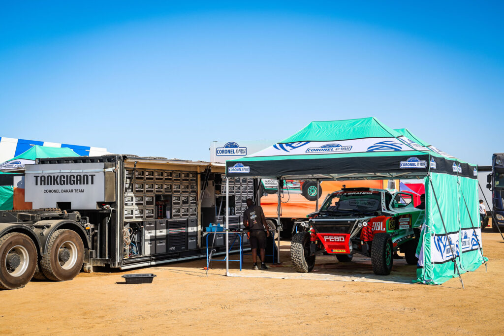 Na de zeer geslaagde uitzwaaidag op 23 november bij het Coronel Adventure klimpark in Huizen gingen de auto’s en het materieel op transport naar Saoedi-Arabië. De wedstrijdauto van de Coronels is de Century CR7 T1+, een speciaal voor de rally-raids gebouwde auto, aangedreven door de beproefde Audi 2,9-liter twin-turbo-V6-motor. Met 37 inch banden en een veerweg van niet minder dan 350 millimeter is de auto uitstekend geschikt voor gebruik in zwaar terrein. “En dat gaan we beslist tegenkomen”, weten Tim en Tom Coronel, niet in de laatste plaats ook dankzij hun ervaring van de afgelopen jaren.