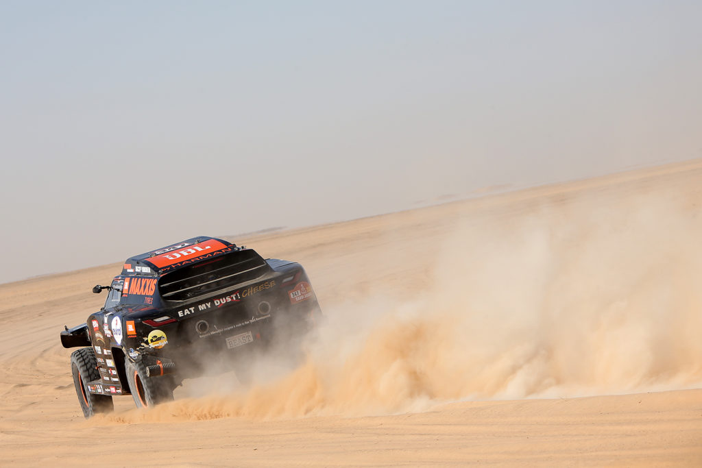 WADI AL DAWASIR – The eighth stage of the 2020 Dakar Rally was an old-fashioned endurance test: dunes, stones, fast tracks and a forty kilometres long straight on a vast stretch of sand. Tim and Tom Coronel really enjoyed it until a big rock caused trouble.
