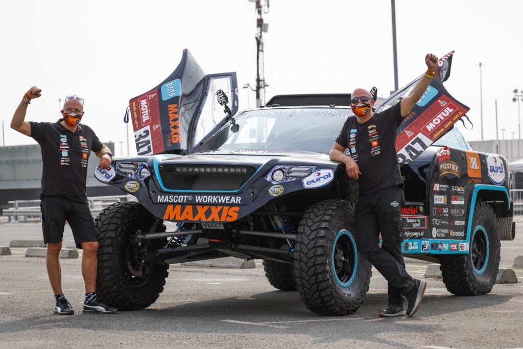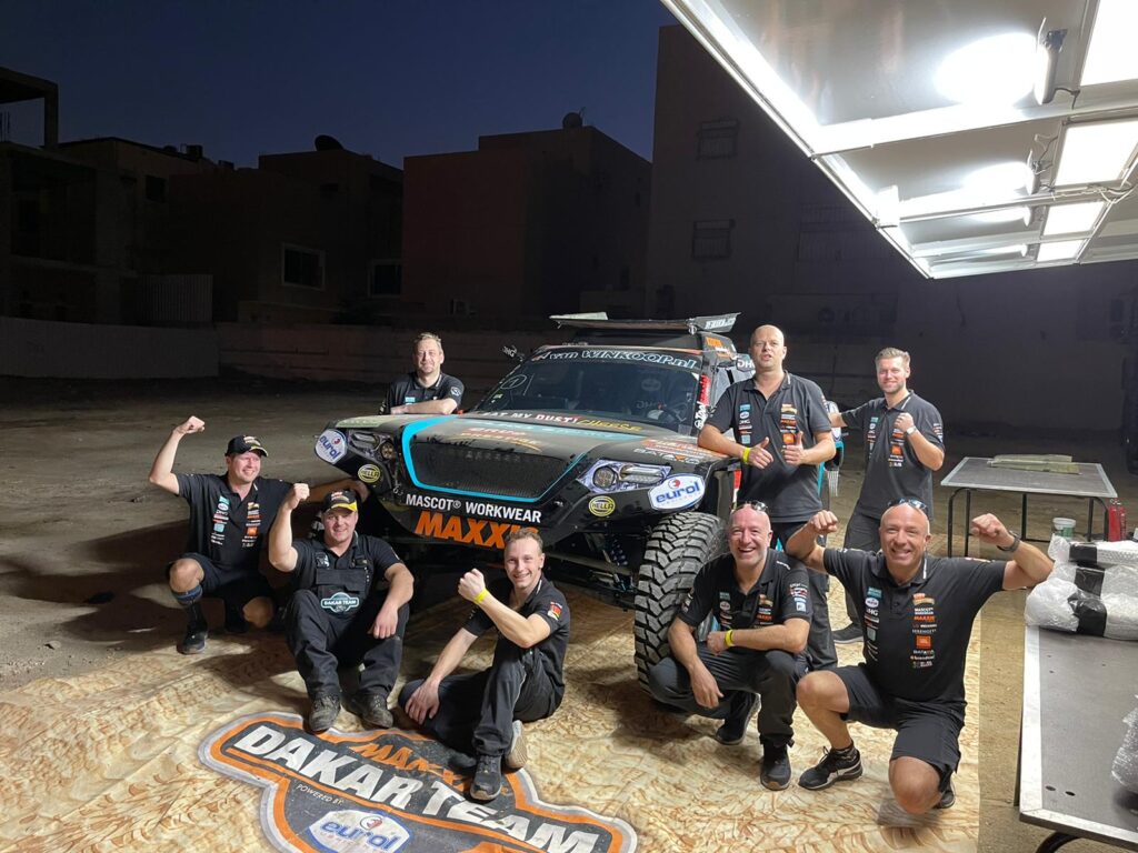 Gisteren voelden Tim en Tom de auto nog een laatste keer aan de tand op een speciaal daarvoor ingericht shakedown-terrein op 50 kilometer van Djedda. “Eenmaal vrijgelaten na de pcr-test was het lekker om The Beast weer te horen en te voelen in het zand”, vindt Tom. “We zijn even de duinen in geweest. Het lijkt wel of we er patent op hebben, maar na 200 meter stonden we al vast. Hebben we dat ook maar gehad.”